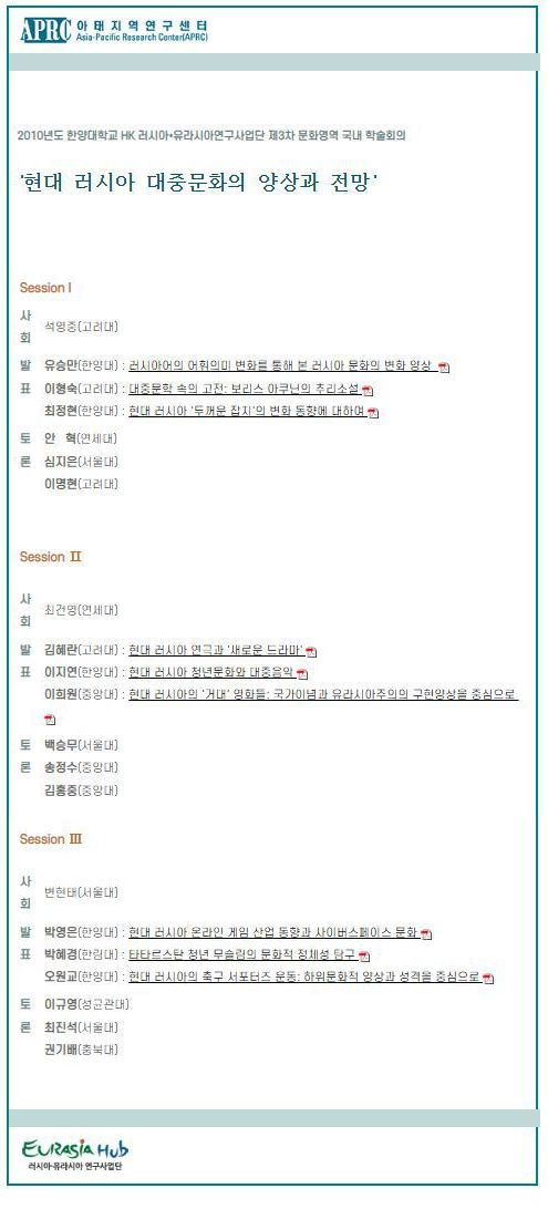 이날 발표된 9편의 논문 필자들은 지난 수개월간 워크샵, 세미나, 유라시아 협의회 발표 등의 단계를 거치며 현대 러시아 대중문화라는 주제에 대해 서로의 의견을 수렴해 나갔다.