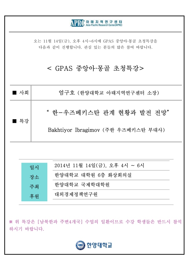 [공지] GPAS 중앙아·몽골 초청특강 (2014.11.14)