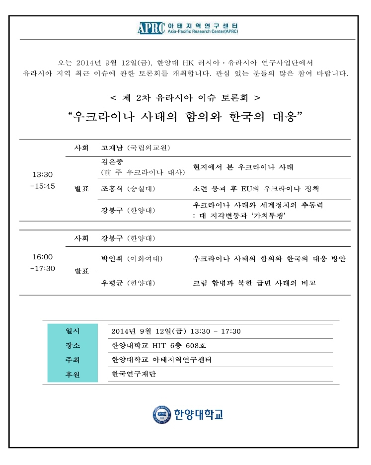[공지] 제2회 유라시아 이슈 토론회 "우크라이나 사태의 함의와 한국의 대응"