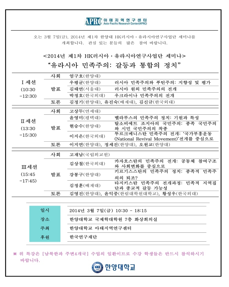 [공지]2014년 제1차 HK 러시아·유라시아연구사업단 세미나"유라시아 민족주의: 갈등과 통합의 정치"