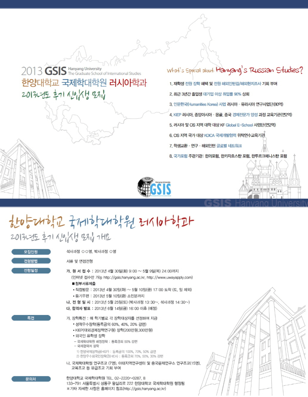 [안내] 한양대학교 국제학 대학원 러시아학과 2013년 후기 신입생 모집