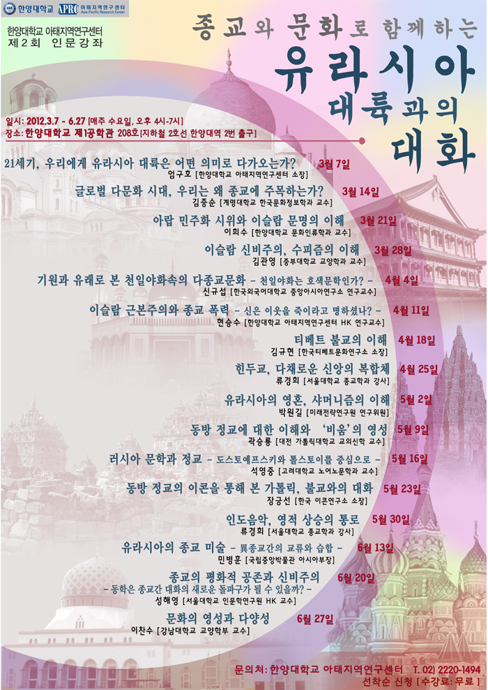 한양대 아태지역연구센터에서는 제1회 인문 강좌 [유라시아의 영웅. 실크로드로 다시 보다]에 이어 제2회 인문 강좌 [종교와 문화로 함께 하는 유라시아 대륙과의 대화]를 3월 7일부터 6월 27일까지 매주 수요일에 진행합니다.
